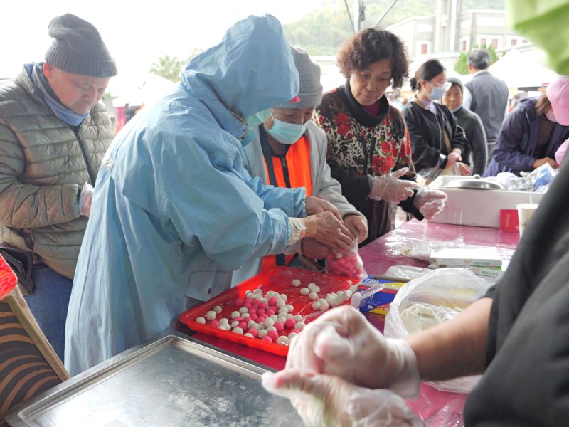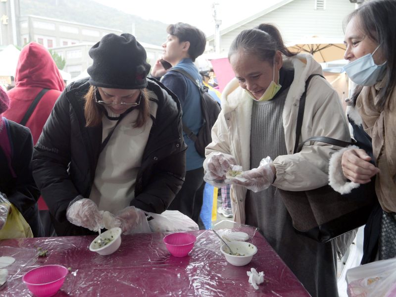活動下半場雖下起毛毛細雨、氣溫驟降,卻澆不熄民眾的熱情。猜燈謎有獎徵答時間,現場民眾踴躍參與;包水餃體驗區同樣熱鬧,不少婆婆媽媽們動作俐落、邊做邊聊天,分享剛剛在年貨大街採買的點心與年貨,讓寒冷天氣中多了份暖意。搓湯圓區也圍滿人潮,大家一邊搓湯圓、一邊話家常,社區重新熱絡起來。